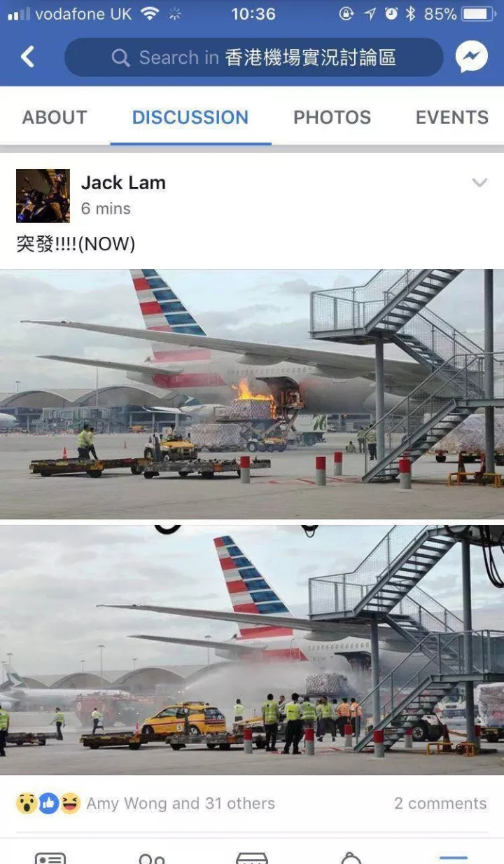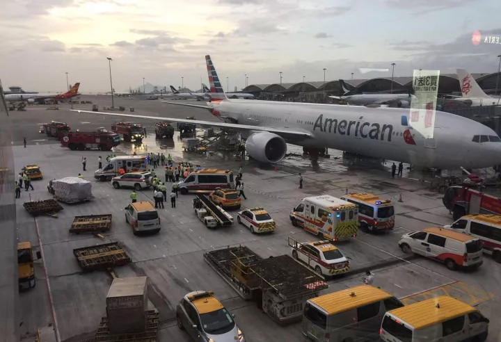 美國(guó)航空一班編號(hào)AA192客機(jī)原定于傍晚6時(shí)10分出發(fā)前往美國(guó)洛杉磯,至下午5時(shí)許于42號(hào)停機(jī)坪停泊時(shí),近機(jī)尾的上貨位置有貨物懷疑起火,火速迅速蔓延,客機(jī)亦被波及?;鹁陂g,有職員逃生時(shí)不慎墜地受傷。消防接報(bào)趕至,迅速將火熄滅,目前起火原因正在調(diào)查中。